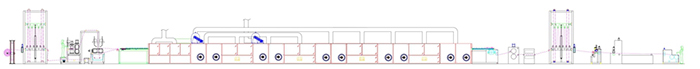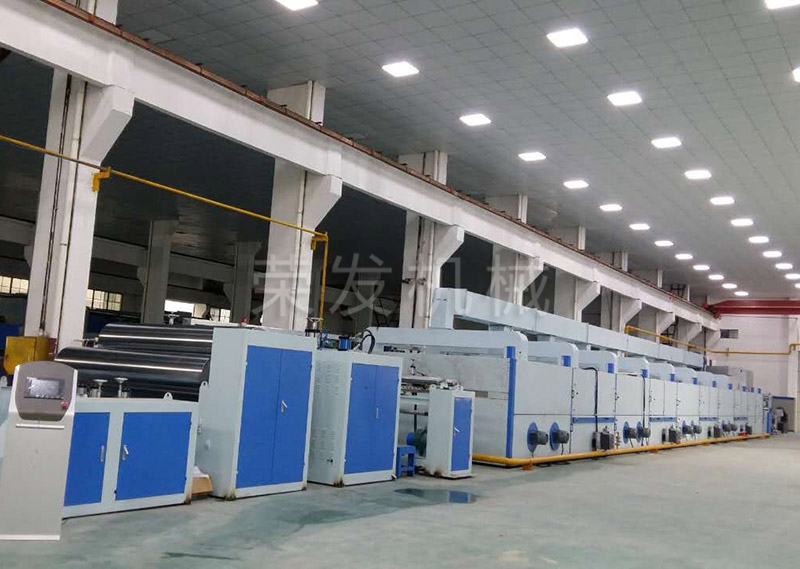 放布→储布→上胶、背胶、喷胶、刮胶、浸胶→拉幅定形→热压烫平→风冷冷却→储布→分条裁边→全自动裁断堆叠→或组合收卷机。