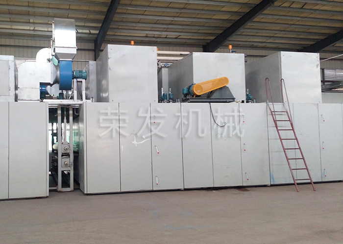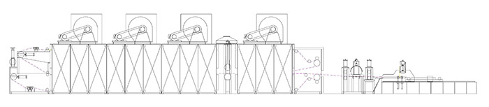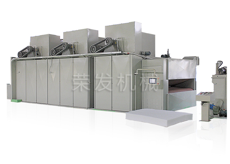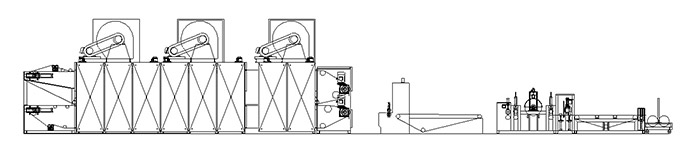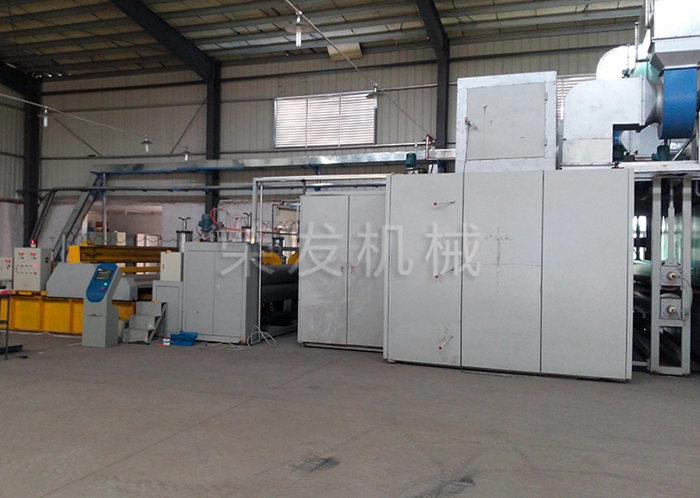 热烘房→冷压定机→冷却定形烘房→罗拉→分条纵裁→罗拉→移动平台式飞刀裁断。