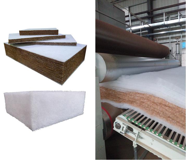 新型化纤椰棕床垫,主要材料椰棕丝、涤纶短纤,不含胶水、甲醛等有害物质,具有无毒、无味、防火、符合欧州环保水平。用于高级床垫、沙发垫等。