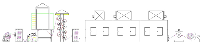 放布架→上浆机→红外线干燥器→洗水槽×2→热烫轮组→储布架→烘箱→储布架→收卷机。